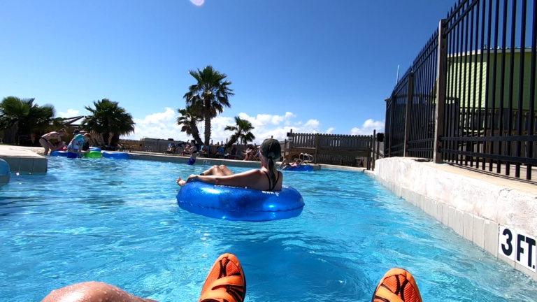 Float under the Texas sun, surrounded by lush greenery and the gentle sway of palm trees. The turquoise water sparkles as you drift along the calm, winding lazy river — a perfect blend of relaxation and joy.